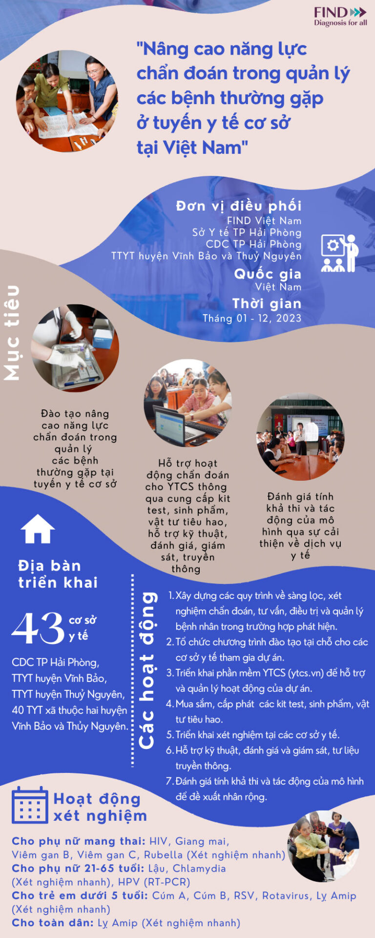 Đây là buổi tập huấn đầu tiên trong chuỗi tập huấn cho 43 cơ sở y tế được chọn tham gia dự án, bao gồm CDC Hải Phòng, TTYT huyện Vĩnh Bảo, TTYT huyện Thuỷ Nguyên và 40 TYT xã thuộc hai huyện Vĩnh Bảo và Thủy Nguyên, thuộc khu vực thành phố Hải Phòng. Các đại biểu đã nêu rõ quyết tâm cùng nhau đẩy mạnh các hoạt động được hỗ trợ bởi FIND, cũng như thảo luận các giải pháp và phương hướng để đạt được các mục tiêu của dự án. Dự án này một lần nữa nhấn mạnh nỗ lực của FIND trong việc hỗ trợ tăng cường năng lực chẩn đoán tuyến YTCS, từ đó tăng cường tiếp cận các chẩn đoán thiết yếu cho người dân, đặc biệt là khu vực nông thôn, đồng thời cải thiện chất lượng công tác quản lý và giám sát các bệnh thường gặp tại tuyến YTCS. Tính khả thi và tác động của mô hình sẽ được đánh giá vào cuối dự án để đề xuất nhân rộng.